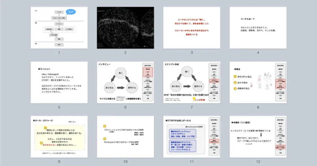 プレゼンテーションのスライドデザインは、概ねこのような形で進行する。関わり方は人それぞれだと思うが、個人的には、デザイナーだけでなくコーチや、もちろんスピーカーと一緒になって創り上げるという姿勢で臨むようにしている。
