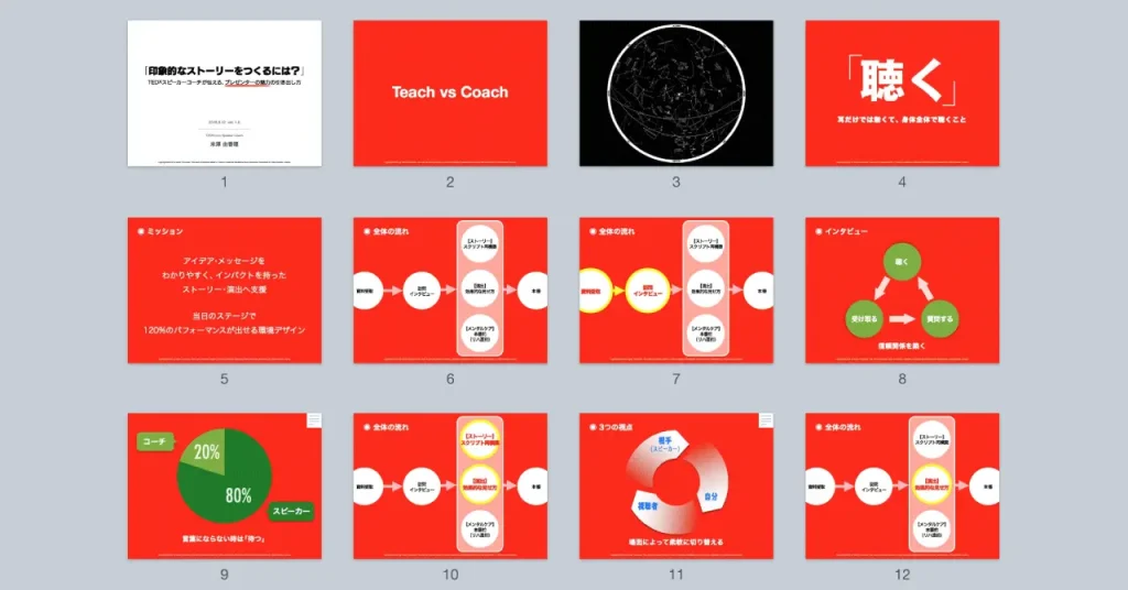 この、『「印象的なストーリをつくるには?」TEDxKyotoのコーチが伝える、スピーカーの魅力の引き出し方』スライド制作の過程を公開し、スライド制作におけるデザイナーの役割についてお話したい。