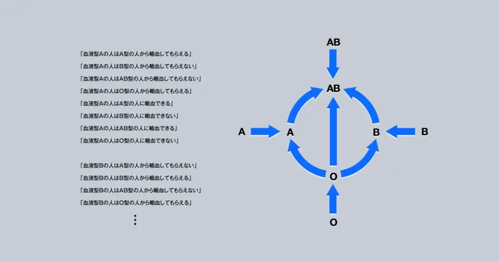 項目同士が並列の関係ではなく、互いに影響を与えるようなものの場合は図解にするとわかりやすい。よく例として出されるものだが、輸血と血液型の関係について、文章と図解とで比較すると下のようになる。